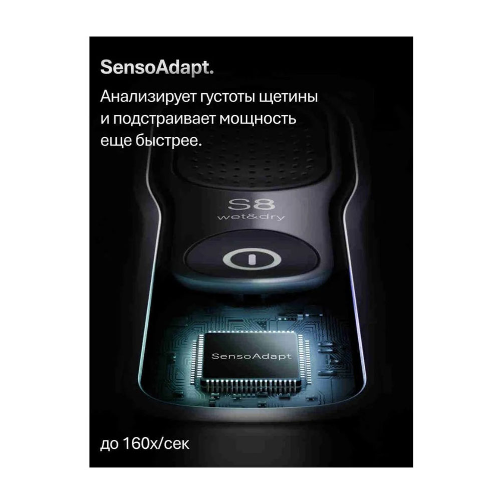 Уникальная технология Sonic обеспечивает захват большего количества волос за счёт 10 000 микровибраций, значительно улучшая эффективность бритья, а технология SensoAdapt сканирует густоту щетины и автоматически подстраивает мощность до 160х/сек. 100%